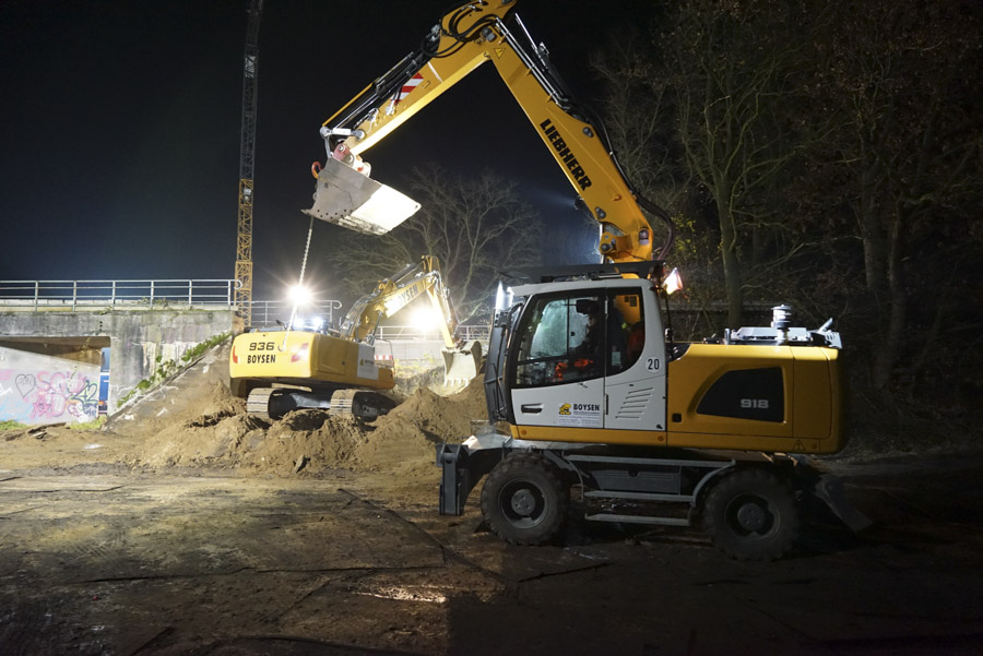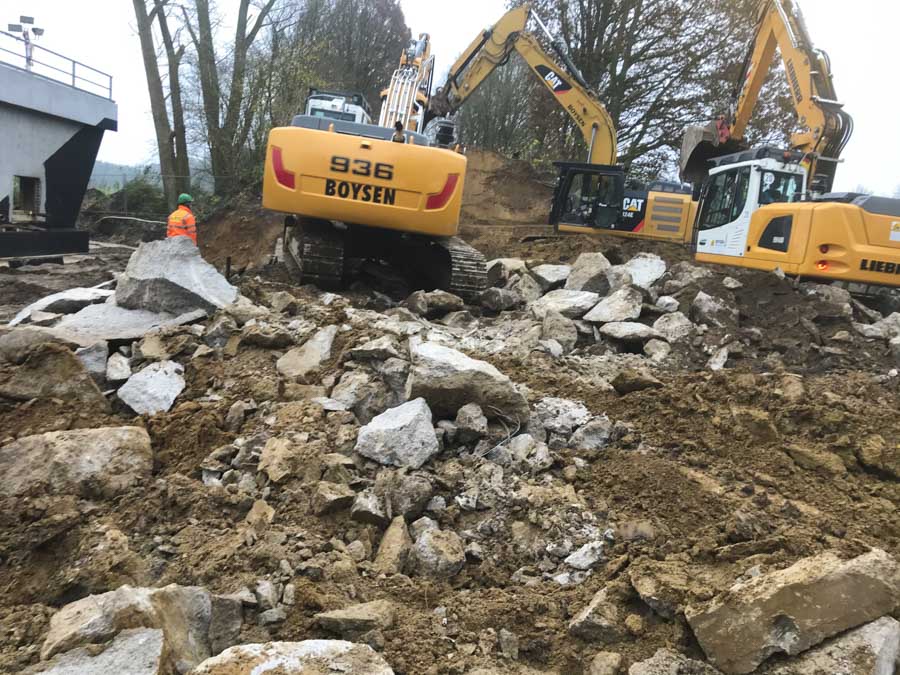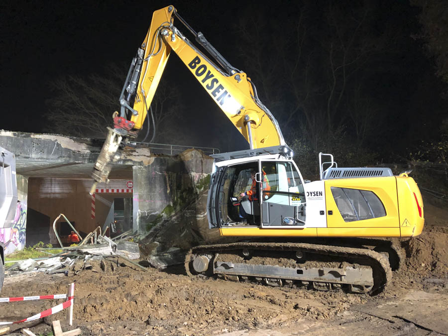 Komplettabbruch, Verwertung und Entsorgung einer Eisenbahnbrücke aus Stahlbeton, in Nacht- und Wochenendarbeit